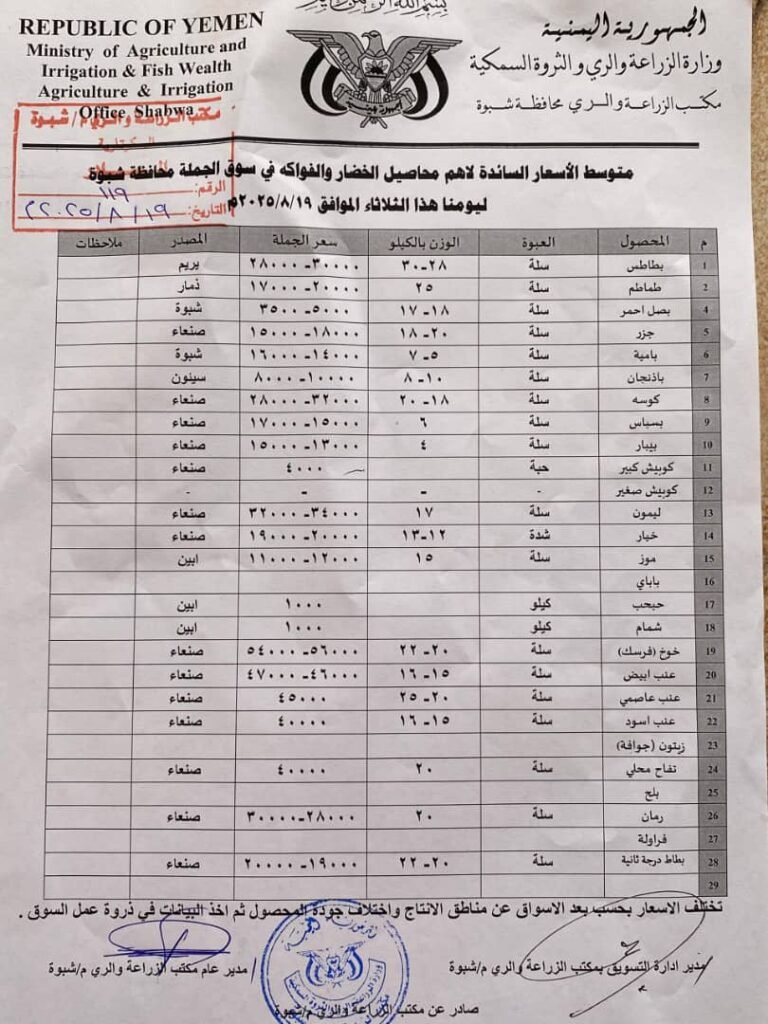تنفيذًا لتوجيهات محافظ محافظة شبوة، رئيس المجلس المحلي، عوض محمد بن الوزير، وضمن الإجراءات الحكومية وتوجهات البنك المركزي لضبط الأسعار وتعزيز الاقتصاد الوطني وحماية المستهلكين، أصدر مكتب الزراعة والري قائمة بمتوسط أسعار المنتجات الزراعية في المحافظة، شاملة الخضروات والفواكه، مصنفة بحسب مصدرها.