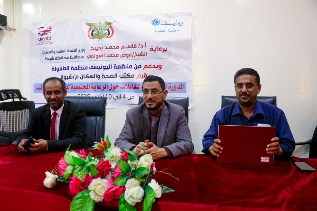 وأشار الدكتور الذيب إلى أن الدورة تأتي ضمن خطة الوزارة ومنظمة اليونيسف لتوسيع برامج الرعاية المجتمعية في المحافظات، بما يعزز منظومة الرعاية الصحية الوقائية والعلاجية، موجهاً الشكر والتقدير لقيادة الوزارة والسلطة المحلية بالمحافظة على اهتمامهما الكبير بقطاع الصحة ودعمهما المتواصل.