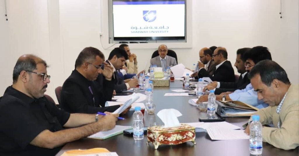 عقد مجلس جامعة شبوة، صباح اليوم، اجتماعه الدوري برئاسة رئيس الجامعة الأستاذ الدكتور توفيق سريع باسردة، لمناقشة جملة من القضايا الأكاديمية والتنظيمية المدرجة على جدول أعماله.