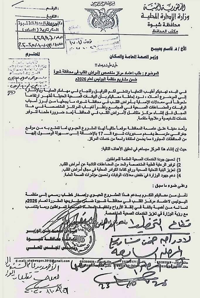 وثمّن الدكتور علي ناصر الذيب، مدير عام مكتب الصحة والسكان بالمحافظة، ونيابةً عن السلطة المحلية ممثلةً بالمحافظ بن الوزير، سرعة تجاوب معالي الوزير مع مطالب السلطة المحلية بإنشاء مركز القلب التخصصي في شبوة، مؤكداً أن ذلك يأتي في إطار حرص المحافظ بن الوزير على الارتقاء بالخدمات التخصصية والعلاجية لأبناء المحافظة وتعزيز حضورها الطبي المتطور.