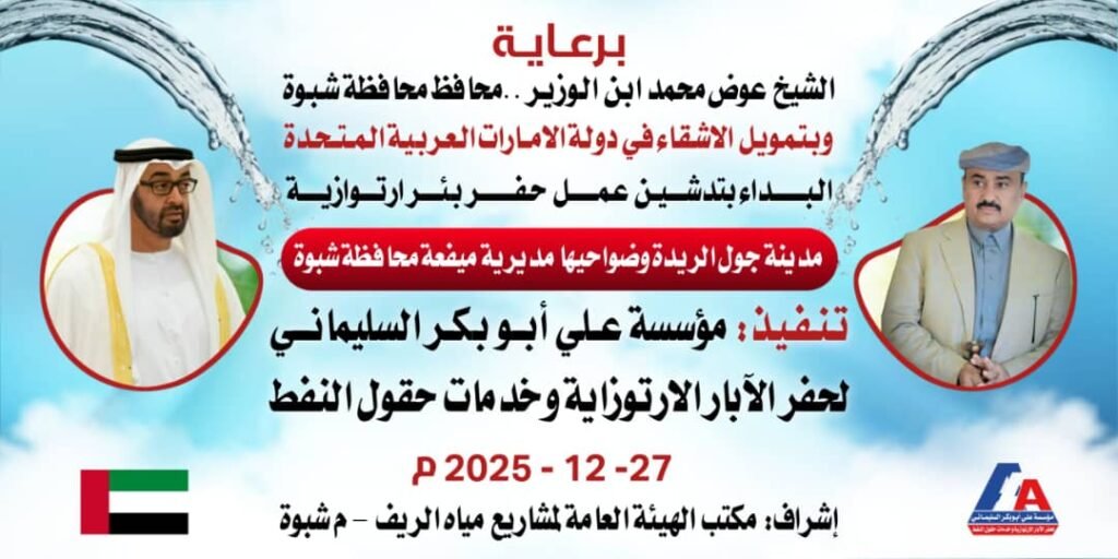 وقام وكيل محافظة شبوة سالم صبيح، ومعه مدير عام هيئة مياه الريف بالمحافظة المهندس مروان بارويس، مدير عام مديرية ميفعة محمد سعيد بافقير، بتسليم موقع مشروع حفر البئر، التي يبلغ عمقها 140 مترًا، وتُعد بئرًا إسعافية بديلة لبئرين خرجا عن الخدمة، ليستفيد منها أكثر من 12 ألف نسمة في منطقة الريدة وضواحيها.