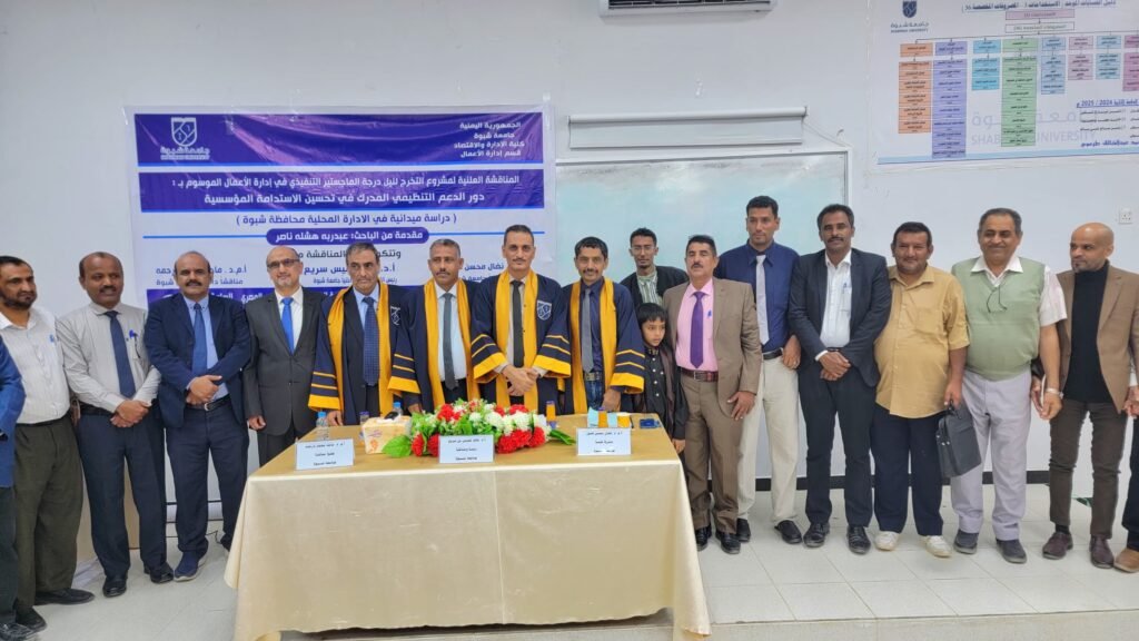 ويُشار إلى أن هذه الرسالة تُعدّ الأولى من نوعها في برنامج الماجستير التنفيذي بكلية الإدارة والاقتصاد بجامعة شبوة، بما يمثّل محطة أكاديمية فارقة في مسار الدراسات العليا بالجامعة، ويعكس تنامي قدراتها المؤسسية في تقديم برامج نوعية تواكب متطلبات التنمية والإدارة الحديثة.