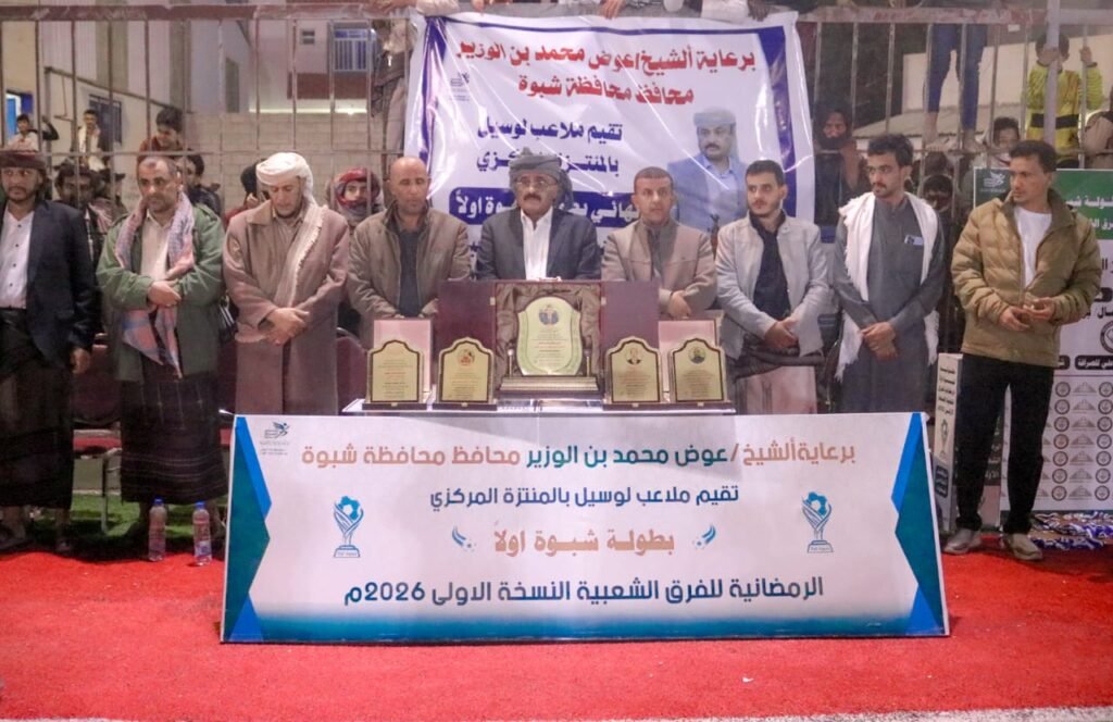 برعاية كريمة من محافظ محافظة شبوة عوض محمد بن الوزير، وضمن شعار “شبوة أولاً”، تُوِّج فريق النجوم الصديق الرياضي بمدينة عتق، مساء الثلاثاء 21 رمضان 1447هـ، بطلاً للبطولة الرمضانية الأولى للفرق الشعبية بمحافظة شبوة لكرة القدم لعام 2026م، عقب فوزه على جاره فريق الجيش الرياضي بهدفين مقابل هدف، في المباراة النهائية التي احتضنها ملعب لوسيل بالمنتزه المركزي بمدينة عتق، وسط حضور جماهيري كبير وأجواء حماسية لافتة.