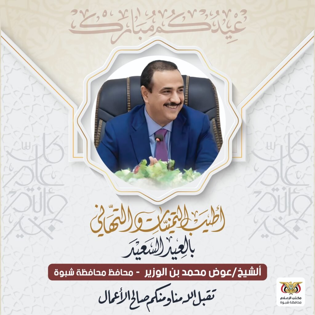رفع محافظ محافظة شبوة، رئيس المجلس المحلي، عوض محمد بن الوزير، أسمى آيات التهاني وأصدق عبارات التبريكات بمناسبة حلول عيد الفطر المبارك، إلى القيادة السياسية ممثلة بفخامة الدكتور رشاد محمد العليمي، رئيس مجلس القيادة الرئاسي، وإخوانه أعضاء مجلس القيادة، ورئيس وأعضاء الحكومة، وإلى أبناء محافظة شبوة وكافة أبناء الوطن.