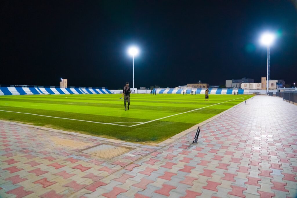 منظومة الإنارة، تأهيل المدرجات، أصلاح وتأهيل المضمار، وتركيب السياج الحديدي المحيط بالمستطيل الأخضر.
