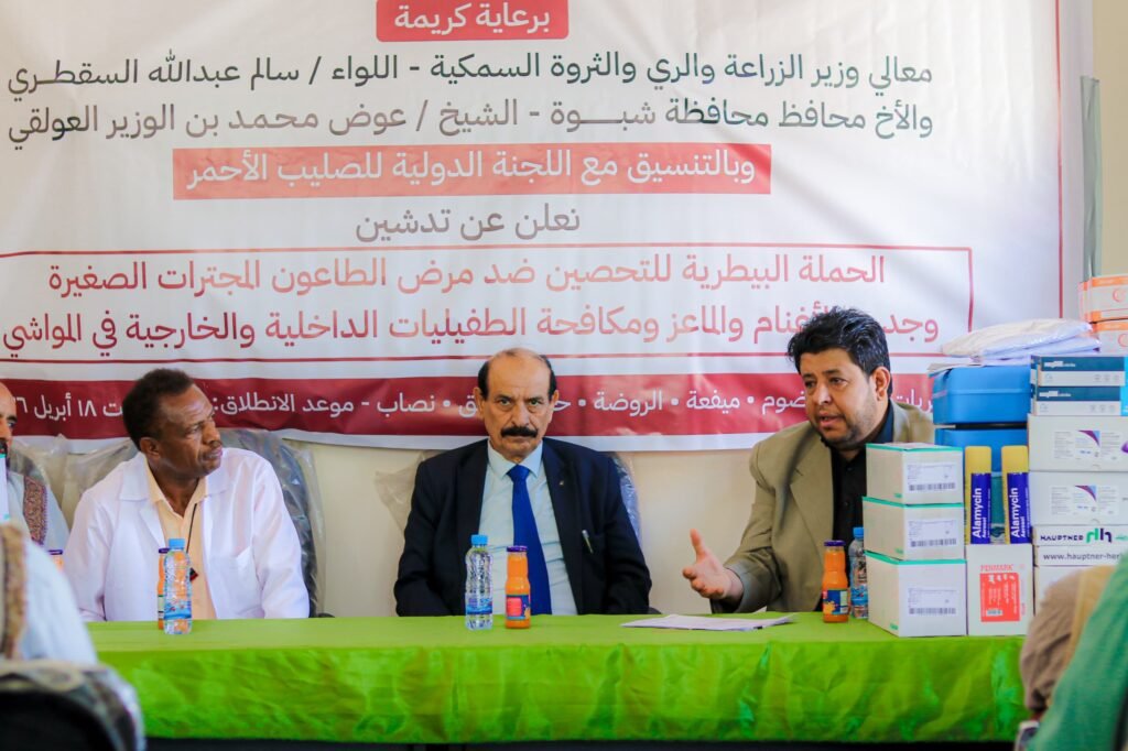 برعاية معالي وزير الزراعة والري والثروة السمكية اللواء سالم عبدالله السقطري، ومحافظ محافظة شبوة عوض محمد بن الوزير، دُشّنت صباح اليوم السبت الحملة البيطرية للتحصين ضد مرض طاعون المجترات الصغيرة وجدري الأغنام والماعز، إلى جانب مكافحة الطفيليات الداخلية والخارجية في المواشي، وذلك في عدد من مديريات محافظة شبوة، بتمويل من اللجنة الدولية للصليب الأحمر، وبالتنسيق مع الإدارة العامة لصحة الحيوان بوزارة الزراعة والري والثروة السمكية ومكتب الزراعة والري بالمحافظة.