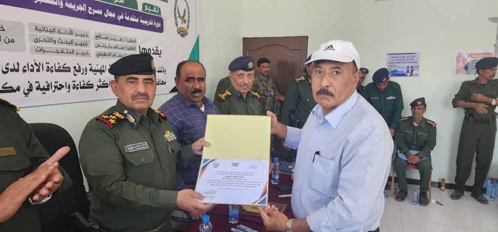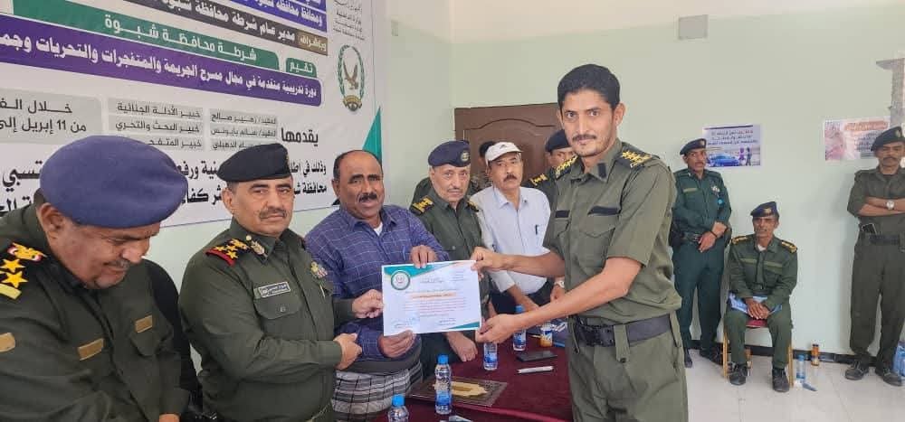 اختتمت اليوم في محافظة شبوة، دورة تدريبية متقدمة في مجال مسرح الجريمة والمتفجرات والتحريات وجمع الاستدلال، وذلك برعاية معالي وزير الداخلية، اللواء الركن إبراهيم علي حيدان، ومحافظ محافظة شبوة، رئيس اللجنة الأمنية، عوض محمد بن الوزير، وبإشراف مدير عام شرطة محافظة شبوة، العميد الركن فؤاد محمد النسي.
