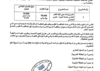 السلطة المحلية شبوة تعلن انزال مناقصة لمشروع انشاء مبنى كلية الطب البشري جامعة شبوة.